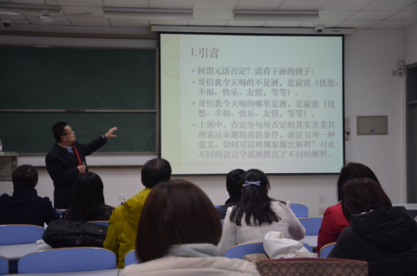 讲座伊始,刘老师旁征博引,通过分析流行用语“哥们我喝的不是酒,是寂寞”,生动地解释了“何谓元语否定”,并区分了元语否定与传统的描述性否定。随后,为了揭示元语否定与非真值条件的关系,刘老师创设出具体的会话情境,分析了话语的会话含意和规约含意。根据语用学和认知语言学的理论知识,刘老师从不同方面对元语否定作出解释,并对这两种解释作出批判性的评述,进而指出其各自的局限性。最后,刘老师详细介绍了元语否定的形成机制,说明了选择与元语否定、辖域与元语否定、标量调整与元语否定以及扫描方式与元语否定的联系。在提问环节中,刘老师针对在座师生所提问题做出了细致耐心的解答,并劝告同学们要想深入了解某一学派,就要推本溯源,反复读书,这样才能对其有全面透彻的认识,从而做到推陈出新。