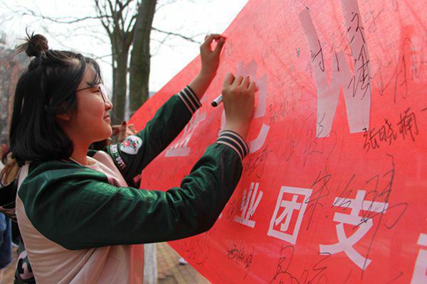 玉兰苑餐厅西门门口,17级英语专业“地球一小时,蓝色We来”主题团日活动正如火如荼地进行着,现场聚集近百人。为号召大学生减少能源消耗,唤起人们以实际行动应对全球变暖的意识,17级英语专业全体同学于3月24日展开“地球一小时,蓝色We来”宣传活动。
