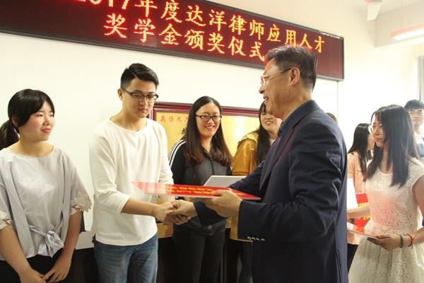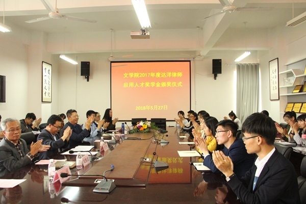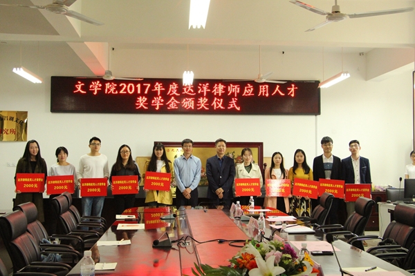5月26日下午,文学院于文理楼358室举行2017年度达洋律师应用人才奖学金颁奖仪式,2018年度国家司法考试中取得佳绩的学生获得奖学金。本次会议由法学系主任秦勇主持,达洋律师事务所主任孙瑞玺,律师苏守轩,文学院院长王学栋,文学院党委副书记邹维忠,文学院团委书记赵振华和法学系副主任孙增芹出席,法学专业学生代表参加。