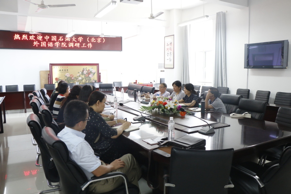 7月18日上午,中国石油大学(北京)外国语学院院长赵秀凤、党委书记李玉财一行10人来全讯调研工作。根据安排,此次调研从学院管理、学生工作、英语专业、公共英语等方面分为四个小组进行座谈。文学院院长王学栋、党委书记张永宁等学院领导班子和相关系部负责人参加了会谈。