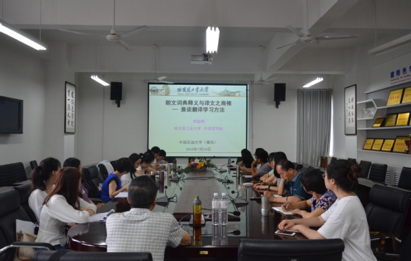 为加强翻译硕士人才培养,7月24日上午,文学院于文理楼358举办“工科院校翻译硕士人才培养”主题讲座。本次讲座由哈尔滨工业大学外国语学院翻译教育中心主任郑淑明教授主讲,文学院副院长孙大满为主持人,文学院副院长王新博、翻译硕士导师、任课教师以及翻硕学生参加了此次讲座。