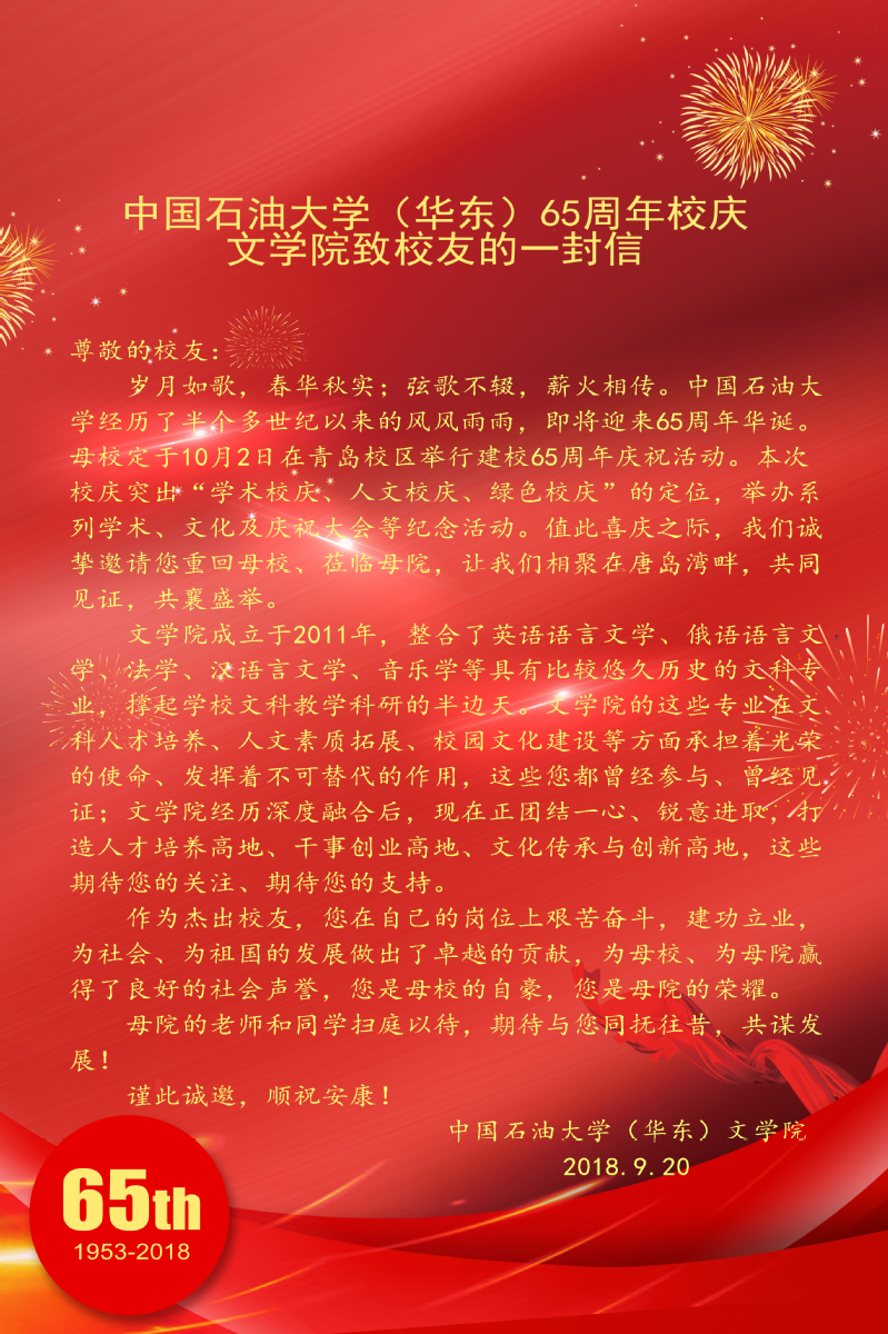 中国石油大学(华东)65周年校庆文学院致校友的一封信