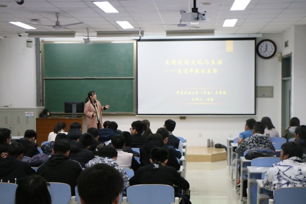 11月10号,由文学院党委主办,俄语语言文学系党支部承办的第五届国际文化大观园系列讲座之“美国之旅那些事”于南教楼314举行。本次讲座由文学院英语系讲师、文学院团委副书记付晓主讲,校内众多对美国文化有浓厚兴趣的学生参加。