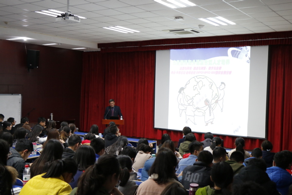 2018年11月19日黄岛文法讲坛第三讲开讲,学院邀请著名翻译专家,首都师范大学李军教授做客黄岛文法讲坛,作题为《高级翻译训练与外语复合型人才自修》的讲座。文学院副院长孙大满教授主持讲座。学院部分翻译领域的教师和翻译硕士研究生及全校翻译爱好者近二百人聆听了讲座。