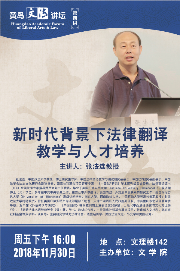 【黄岛文法讲坛】第四讲预告--张法连教授:新时代背景下法律翻译教学与人才培养