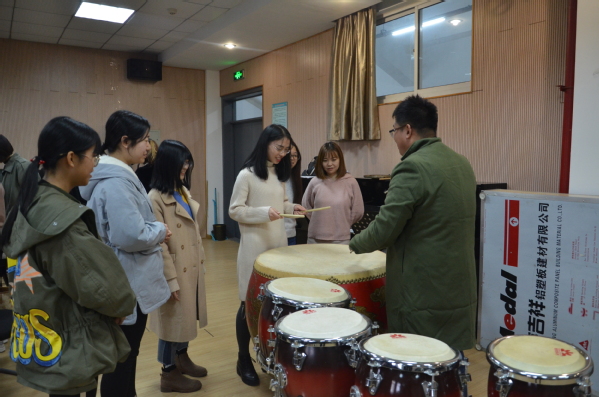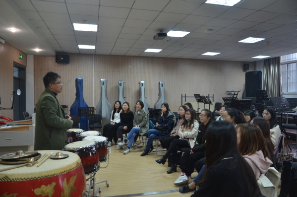 活动以民族乐器为载体,分别展示了中国民乐在吹、拉、弹、击四个方面的魅力。首先,王瑾向同学们介绍了二胡名字的由来、琴身各个部分的材质、握琴的手势、二胡的种类等基本知识,并演奏了二胡名曲《赛马》,奔腾的旋律深深吸引了在场的所有同学。接着,张晓雯用竹笛吹奏了一曲《燕归来》,并展示了剁音、花舌、打音等演奏技巧,赢得了阵阵掌声。演奏完毕,她还向同学们介绍了竹笛的基本构造和与乐器分类。陈彦旭一曲《渔舟唱晚》悦耳动听,勾抹托颤的指法尽显古筝魅力。她说,古筝是一件古老的中国乐器,距今已两千五百多年,所以与西洋乐器不同只有五声音阶,又因为它可以两手弹奏,被称为是“中国的钢琴”。李汉老师向同学们展示了中国打击乐器,介绍了中国打击民乐的起源、历史地位和文化影响,讲解了如何区分打击乐器锣和镲,从历史、种类、文化意义等方面着重介绍了民族乐器——鼓。他表示,民族打击乐器在与舞台表演的结合上胜于其他民族乐器,非常具有情绪渲染力,在统一整个舞台的节奏方面起着非常重要的作用。李汉还为同学们展示了一段雄厚的鼓乐《龙腾虎跃》,引来同学们的赞叹。最后,在场同学与老师和演奏的三位学生进行交流,老师和三位音乐系的学生耐心聆听,解答问题,并手把手进行教学。