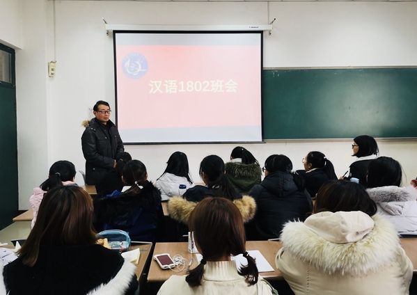 各班班主任根据开学以来学生表现以及班级活动情况进行总结,并在专业学习方面与学生进行深入讨论。对于期末备考问题,法学1801班班主任冷凌为学生“支招”,传授了“抓重点、多提问、做真题”的高效复习方法,并结合自身学习经验对理科同学们的法学学习做了相关指导;汉语言文学1801班班主任沈壮娟提出希望学生对考试有正确的态度和认识,严肃考风考纪,积极备考。当提到如何高效记忆单词、纠正发音,英语1801、1802班班主任付晓和陈效新则建议学生养成每天积累一定量单词的好习惯,强调道词汇量是语言类学生的基础;俄语1802班班主任孙锦告诫学生,学习外语没有捷径,要多听、多读、多说、多写,要坚持早读,并希望学生能够持之以恒。在个人和班级发展方面,汉语言1802班班主任陈在东表扬了同学们情商较高、沟通能力强的优点,分析了汉语专业的潜在优势,鼓舞了同学们的自信心;法学1802班班主任董岩同学生就班级相关问题交流时强调:“我们学法的人尤其强调权利与义务。当我们的班集体朝着一个好的方向发展的时候,班级里的同学都会相应的受益,这是你的权利;但是与此同时,好的班级需要大家每一个人都积极履行自己的义务,你的义务就是积极努力奋斗,不拖班级后腿,促进班级向更好的方面发展。”