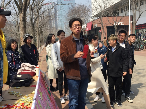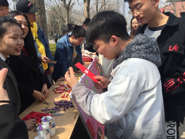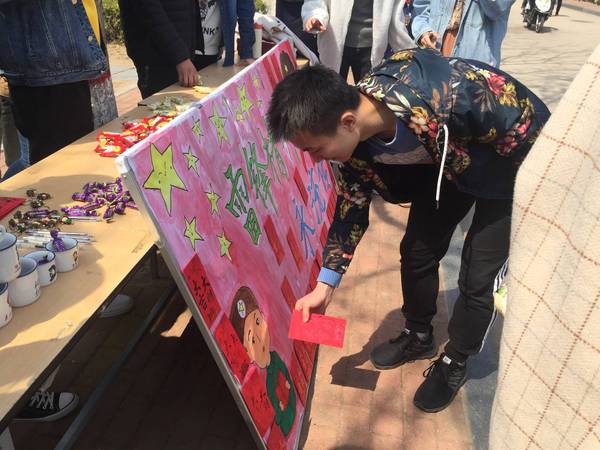“雷锋精神的核心是什么?”活动现场,一位同学一手拎着暖水瓶,一手拿着红包,对贴在后面的题目做出选择。生动有趣的活动方式吸引了来自不同院系师生的注意,大家纷纷驻足。本次活动采取有奖问答的形式,2016级汉语言文学专业团支部将雷锋同志的生平事迹改编为题举行有奖竞答。 “你们把有意义的活动办得很有意思。你们出的题目很好,让广大学生对雷锋有了更加深入的了解,在轻松愉快的形式中感悟雷锋精神。”汉语言文学系魏学宝老师说道。“他们的活动形式很新颖,采用 “红包”战术,将题目贴在红包的背面,把答案装进红包里,并把红包贴到提前画好的宣传板报上,我们看到红包就过来啦。我答对了所有的题,还获得了一个搪瓷水杯。”材料学院刘洋说道 。