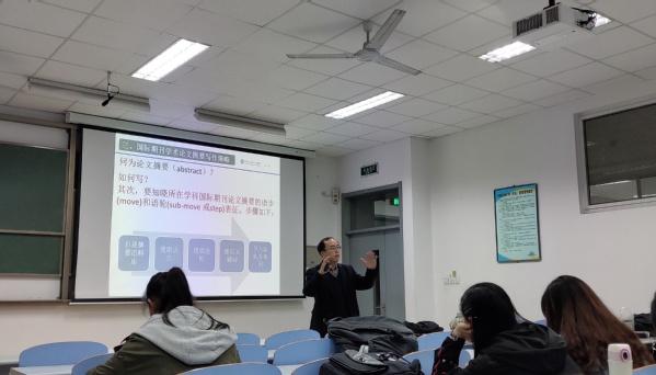 4月28日,文学院“应用写作”系列讲座第二讲——国际期刊论文摘要语步分析及写作策略于南教楼308举行。文学院副院长王新博教授主讲,英语语言文学系主任李燕云主持,吸引了我校众多师生参加。
