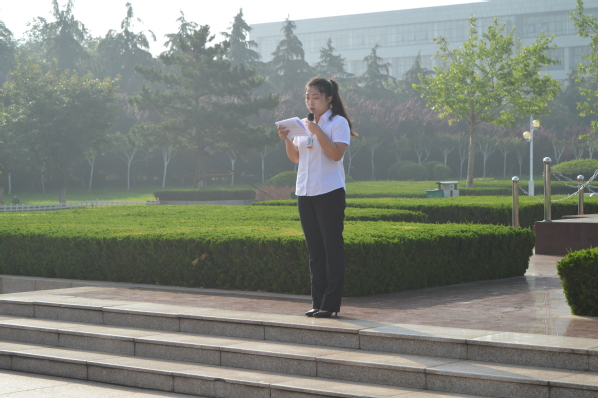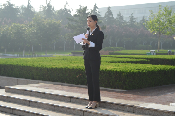 高鑫铭宣布升旗仪式正式开始,全体立正,向国旗行注目礼,并奏唱国歌。嘹亮的歌声与笔直的身躯,彰显了青年人的青春活力。研究生代表汪文华、本科生代表靳雅萱和刘厚旺进行国旗下讲话,三人从“泱泱大国,五彩华夏”“名士风流、心忧天下”“精忠报国、匹夫强志”三方面谈起,呼吁青年师生勇担责任,将满腔热血化为实际行动,献礼祖国。全讯团委副书记丁晓方做《不忘初心,继往开来,青年勇担责》演讲。她梳理中华人民共和国成立七十年历史,举例展示我国发展成就,最后以总书记对青年的寄语作结,希望青年牢记总书记嘱托,建功立业新时代。“希望你们能不负韶华,以梦为马,无愧青春。”她如是说。