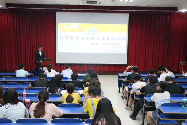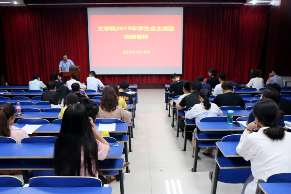 7月3日,文学院主席团竞聘会在文理楼142举行。团委书记赵振华以及全体团委委员、2018届学生会主席团成员、各年级团总支部书记、各年级学生会主席、各年级学生代表担任评委。李昱璇、温宁、张政、李晓彤、王妍、邵芳6位竞选者就学生会改革、学生会定位、青年责任担当等主题阐述自己的观点,并对现场师生评委的提问进行了回答。此次竞聘会由学院团委书记赵振华主持。