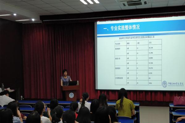 会议伊始,孙大满首先介绍了硕士研究生学位论文开题的注意事项,并且针对论文撰写、论文审核以及论文答辩等相关问题做了详细讲解。她特别强调,所有2018级硕士研究生必须要认真对待论文撰写要求,严格坚守“学术诚信”原则。孙大满同时还强调了2019年将对硕士研究生论文审核采用新手段和方法,提醒同学们一定要重视自己的学位论文,在答辩时候要沉着冷静。随后,在专业实践动员部分,孙大满首先介绍了2019年文学院专业硕士的实践情况,并且给同学们讲解了今年关于开展专业硕士实践的最新政策以及学校对于专业实践所出台的各项保障措施。她在动员会中告诉同学们,今年从教育部、学校以及学院都特别重视专业硕士的专业实践,每位同学的专业实践都实现了“网络化管理”,所有人的实践都可以追本溯源,对于实践情况可以做到一目了然。因此,她要求每一位2018级专业硕士都能认真完成自己的专业实践,坚决服从学校、学院和用人单位的各项安排,注意自己的人身和财产安全,争取早日顺利完成自己的专业实践。