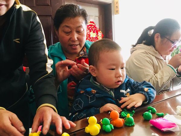 社区奶奶正在志愿者的教学下为孩子捏太空泥 陈嘉婷摄