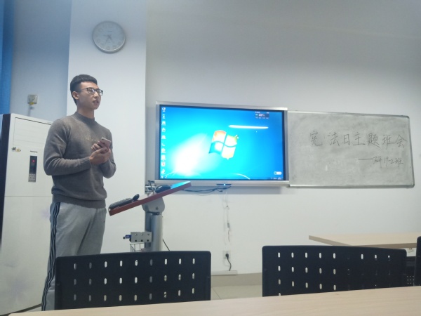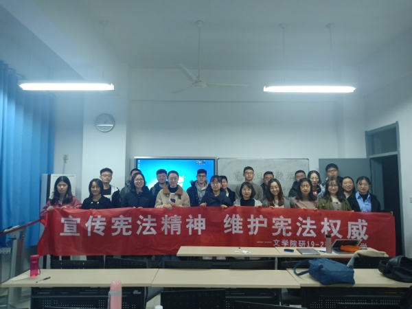 今年正值中华人民共和国成立七十周年,为了推动同学们深入学习宣传宪法、弘扬宪法精神、维护宪法权威,12月4日,文学院研 19-2 班在文理楼432举办了“宣传宪法精神,维护宪法权威”系列主题班会活动,本次班会由班长杨超主持,文研 19-2 班全体成员参加。