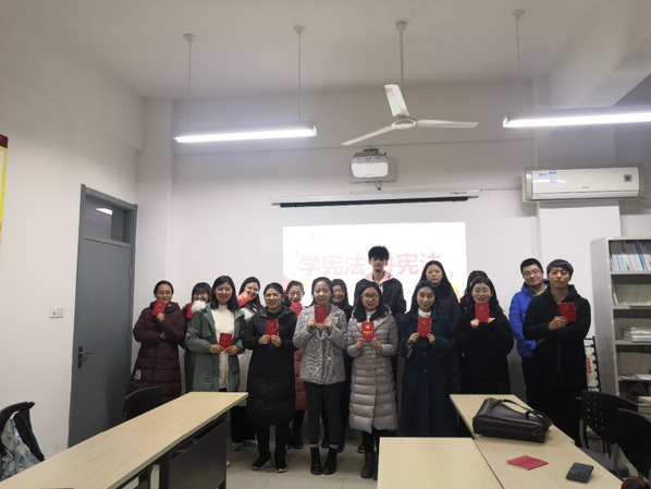 为深入学习贯彻党的十九大和十九届二中、三中、四中全会精神,全面落实习近平总书记关于宪法学习宣传教育的系列重要指示精神,进一步弘扬宪法精神,维护宪法权威,营造尊法学法守法的浓厚氛围,在第六个国家宪法日,第二个全国“宪法宣传周”来临之际, 文学院研1901班于2019年12月6日晚开展了以“学宪法,讲宪法”为主题的团日活动。活动由团支书高菲主持,研1901班全体同学参加了此次主题团日活动。