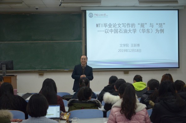 12月18日下午,中国石油大学(华东)文学院副院长,硕士生导师王新博教授在南教117室作了一场题为“MTI毕业论文写作的‘规’与‘范’——以中国石油大学(华东)为例”专题讲座,本次讲座由研究生教学管理部副主任徐小雁老师主持,研究生教学管理部主任淳柳老师及全讯翻译硕士到场聆听了讲座。