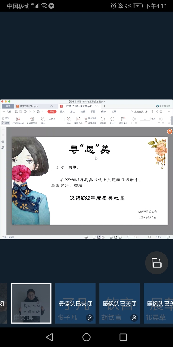 为庆祝第21个思美节,进一步弘扬“自信、自立、自爱、自强”的思美节精神,展现女学生风貌,3月7日下午,由600全讯白菜官方网站汉语言文学专业1802团支部举办的“与女性相伴 迎思美人生”——寻“思”美分享会在线上举行,汉语言文学1802团支部24名团员参加。
