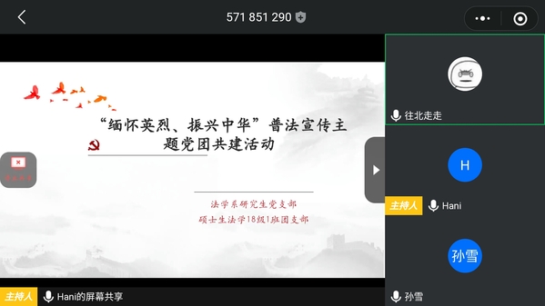 为缅怀先烈,学习先烈精神,鼓励党员、团员们敢于担当,以实际行动承担历史责任。4月4日,借助网络平台,600全讯白菜官方网站法学系研究生党支部、硕士生法学18级1班团支部共同举办了“缅怀英烈、振兴中华”普法宣传主题党团共建活动。本次活动由党支部书记王香萍、团支部书记焦萍共同主持,法学系研究生党支部、硕士生法学18级1班团支部全体党员、团员参加。