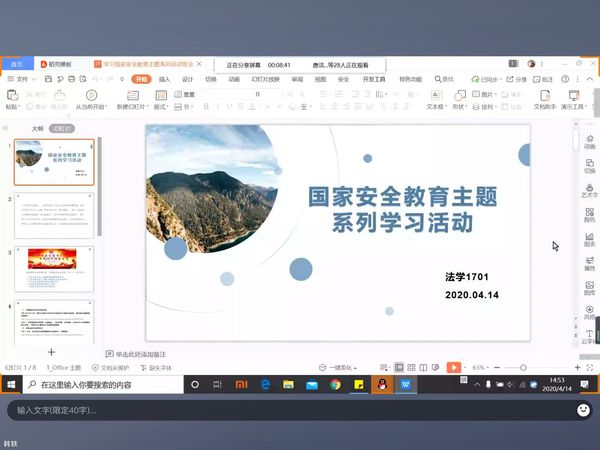 除了参与校内讲座,学院学生也自觉收看了国家安全教育公开课,这有利于其深刻理解国家安全内涵,提高国家安全意识。研究生法学1班的韩世鹏感到警醒:“我们对于自身反省出一个问题:我们是否真正拥有了与之相匹配的是非辨别和个人预警能力?这是我们在对国家安全学习时为自己提出来的最终问题,也是一个不会有答案,而是时刻刻在我们心上,如同警言的问题。”
