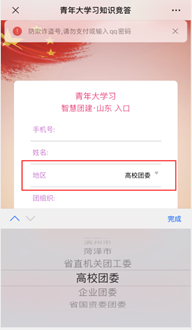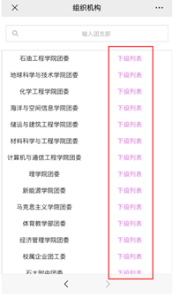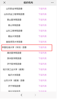 3.输入手机号及姓名后,在地区中选择“高校团委”。在团组织一栏中下滑点击“中国石油大学(华东)团委”右侧的下级列表。在随后出现的列表中选择所对应学院的下级列表,逐级选择至所对应的团支部。