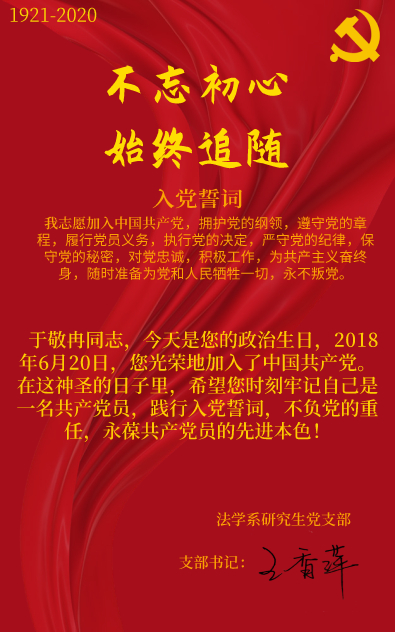 “于敬冉同志,今天是您的政治生日,在这神圣的日子里,希望您时刻牢记自己是一名共产党员,践行入党誓词,不负党的重任,永葆共产党员的先进本色。”法学系研究生党支部为支部成员于敬冉赠送了“生日”祝福电子贺卡,其他各党支部也积极以支部名义向过“政治生日”的党员赠送祝福,勉励其在之后的学习、工作和生活中体悟党员身份,不负党员使命,积极发挥先锋模范作用。