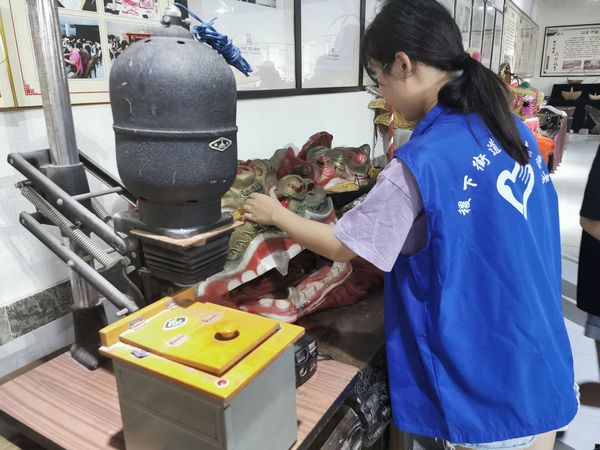 鲁豫冀时光机队员孙怡平查看上世纪舞狮道具 王一迪 摄