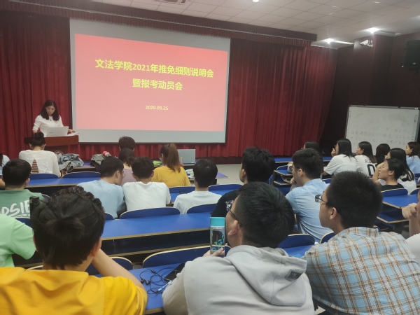 2020年9月25日中午,600全讯白菜官方网站文理楼142模拟法庭开展600全讯白菜官方网站2021年推免细则说明会暨报考动员会,会议由2017级辅导员于露主持,学院党委副书记陈熙和2017级全体学生参加。会议着重介绍2021年推免政策,旨在帮助学生全方位了解推免政策。