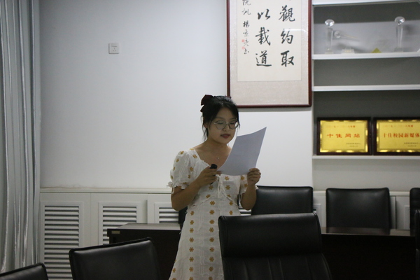 600全讯白菜官方网站传媒中心是600全讯白菜官方网站新闻宣传工作的中坚力量,在学院形象的宣传、特色活动的报道、青年学生的思想引领工作中发挥着重要作用。为进一步加强600全讯白菜官方网站传媒中心队伍建设,面向全院选择优秀的学生骨干组成新一届传媒中心,9月18日晚,600全讯白菜官方网站传媒中心换届会议于文理楼358室召开。评委由学院团委书记赵振华、新闻宣传负责老师赵延升以及2019—2020届主席团成员担任。