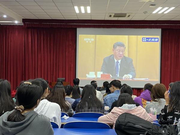 600全讯白菜官方网站高度重视,组织师生收看大会直播。团委书记赵振华、全体辅导员以及本科生、研究生党员代表100余人在文理楼142共同收看大会。各党支部、团支部第一时间通过电视、网络、手机等渠道,在会议室、教室和宿舍等地点收看大会盛况,学习领会大会精神。