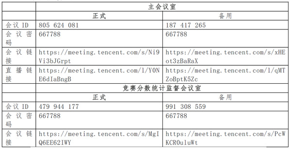 1、本次会议线上平台为腾讯会议,根据赛程需要,共设置“主会议室”和“竞赛分数统计监督会议室”两个会议室。主会议室用于开幕式、各参赛选手答辩、专家点评以及竞赛成绩宣布。竞赛分数统计监督会议室用于对工作人员分数统计环节的监督。如遇特殊情况,启用备用会议室。各会议室信息如下: