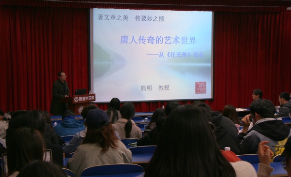 熊明教授娓娓道来,深入浅出,启发同学们从文学的角度来观察、研究唐人传奇。同学们热情高涨,沉浸在了唐人传奇的艺术世界中,现场气氛十分热烈,同学们深感受益。