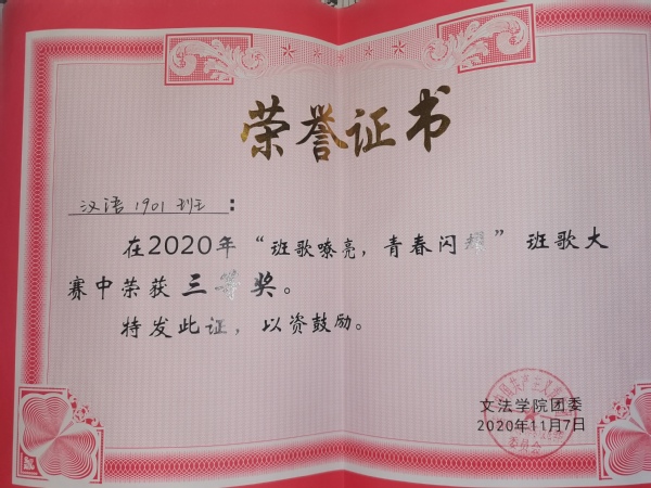 汉语1901团支部参加班歌比赛的歌曲是《我相信》。赛前,全体同学在课业繁重的情况下坚持排练,充分配合,对作品的演绎方式各抒己见,求同存异,极力将歌曲诠释到完美。在正式比赛时,舞台后方的幻灯片上,温馨的班级照播放着专属于汉语1901班的动人的记忆,站在舞台中央的全班同学,用充满热情的歌声激励着在场观众勇敢追寻梦想,加之舞蹈与声乐完美结合,赢来观众的阵阵掌声。值得一提的是,汉语1901团支部凭借着出色的表现,斩获“班歌嘹亮、青春闪耀”班歌大赛三等奖。