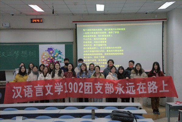 “青年一代有理想,有本领,有担当,国家就有前途,民族就有希望。”未来的五年和十五年,对于新时代青年而言,是成长成才的重要时期;对于新时代中国而言,是创造复兴伟业的关键一程。为激励团支部成员明确自身目标,树立远大理想,绽放青春魅力,汉语1902团支部于12月20日在东环102室开展“放飞青春梦想,奏响时代颂歌”主题团日活动。