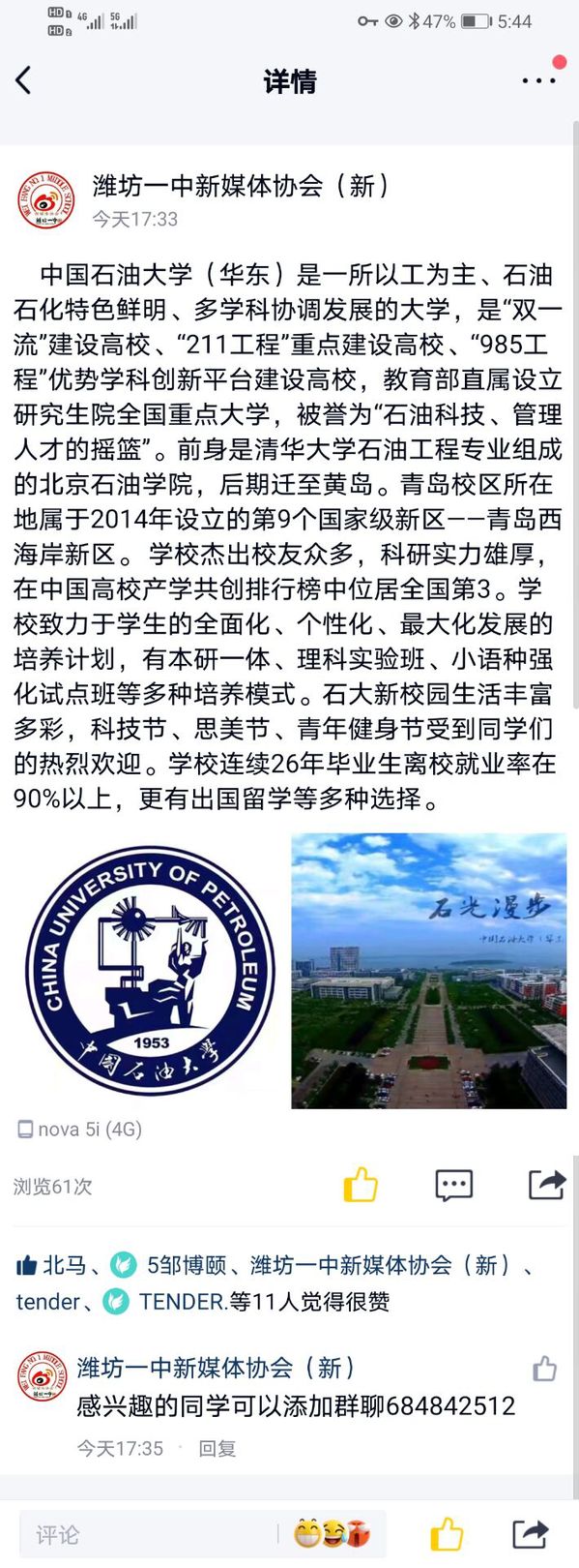 宣讲团队同时建立了中国石油大学(华东)QQ招生宣讲群,将群二维码通过教师进行传播,为有意向报考中国石油大学的高中生以及学生家长进行解疑答惑。同时,利用潍坊一中新媒体协会等新媒体组织,在QQ空间进行帮宣,最大可能地扩大宣传规模,提高中国石油大学的知名度。