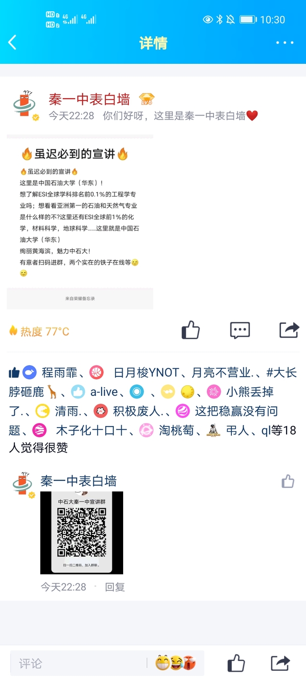 宣讲活动结束后,宣讲队成员保留了宣讲QQ群,随时为有意报考中国石油大学(华东)的秦一中学子进行答疑,并将以秦一中微信公众号为平台进行后期的持续宣传。