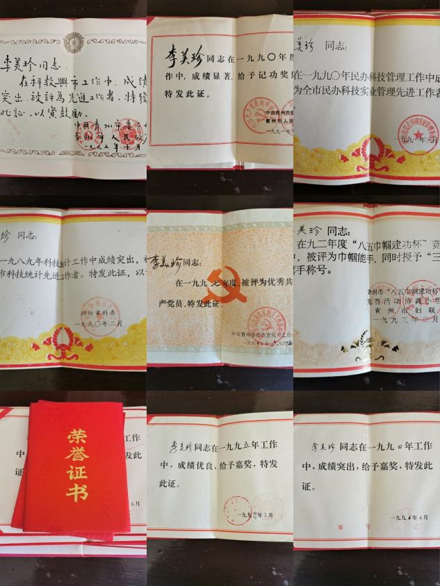 李美珍女士无论是作为一名党员,还是科技工作者,都秉持为党为民的信念,脚踏实地,成绩斐然。但仍保持谦虚的姿态,不计得失。在实践队员的几次请求下,李美珍女士才拿出了放在箱子里的厚厚一沓荣誉证书,科技实业管理先进工作者、科技统计先进工作者、优秀共产党员、“八五巾帼建功杯”巾帼能手、“三八”红旗手......太多太多荣誉称号和奖章证书,见证着她这些年来的奉献历程,可当要拍照时,她只是笑着淡淡说了句:“这些没必要拍啦,也不是什么特别的东西”曾经的巾帼工作者,如今也已成为六十多岁的老人,或许回首当年,老人想起的不是那些风光辉煌,而是默默工作的充实和快乐。