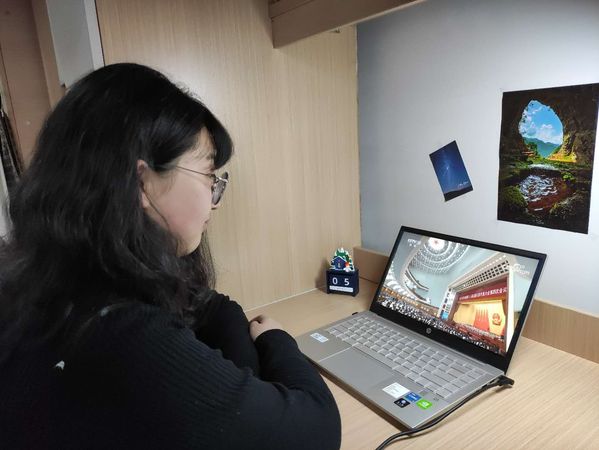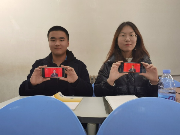 作为一名少数民族学生,汉语2002团支部肖檬在课间用手机观看了直播,“过去的一年,在习近平同志为核心的党中央坚强领导下,全国各族人民顽强拼搏取得了不凡的成就。包括疫情防控取得重大战略成果、我国在全球主要经济体中唯一实现经济正增长和打赢脱贫攻坚战。”