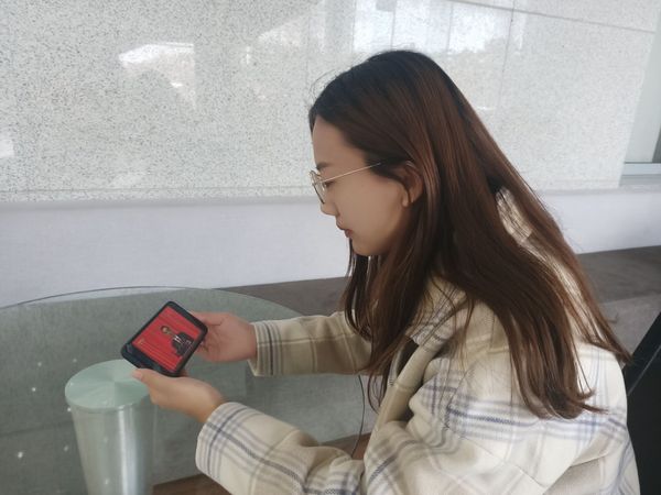 文法学子在图书馆用手机观看直播