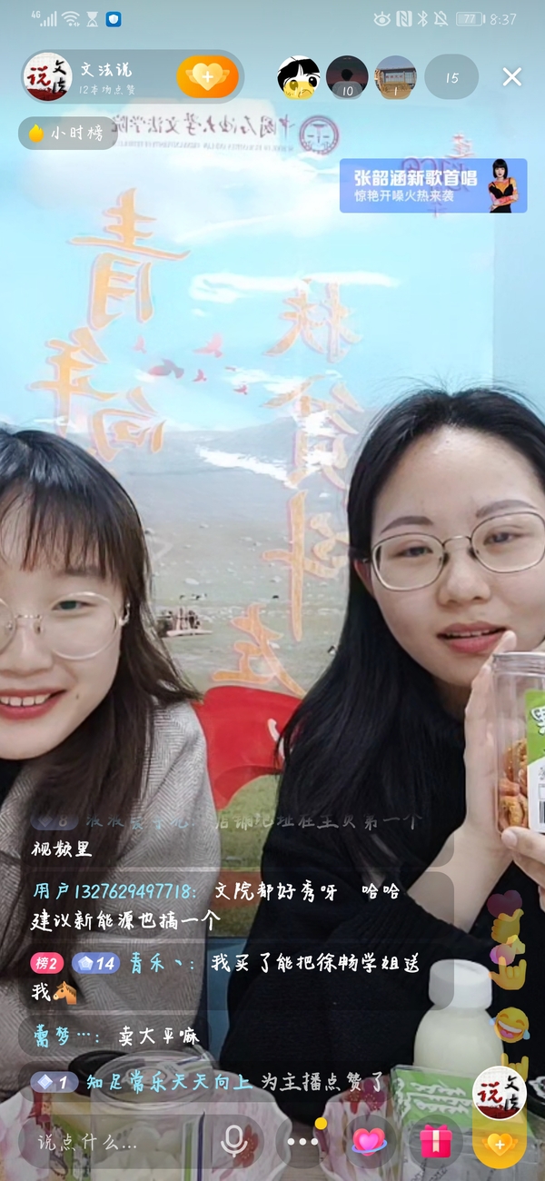“Oh my god,买它买它!这是来自科左后旗的特色产品——奶锅巴,有很浓的奶香味,老人和小孩都可以吃”,来自汉语1902班的高波正在向屏幕前的观众介绍特色产品,“如果你喜欢吃酸的,就买它;如果你喜欢吃甜的,更要买它!”团队在直播期间不时会向观众献上才艺,一首歌曲“好运来”更是将直播间的氛围推向高潮,引发了观众的刷礼物狂潮,两个小时的销售额达500余元。