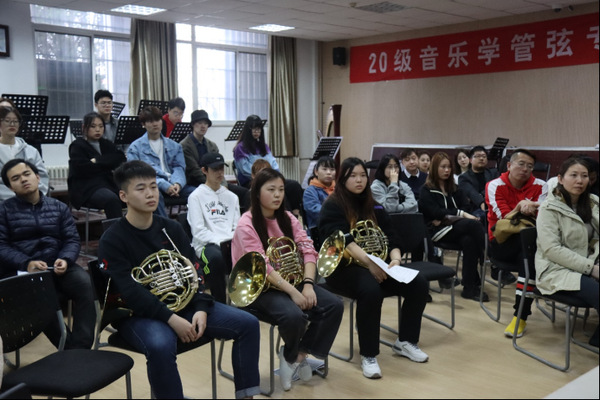 讲座伊始,刘一君为学生普及了铜管乐器的来源、发音原理及分类。随后他对铜管乐器之一——圆号进行重点讲解。他指出圆号作为一种十分有难度的乐器,能够展现出铜管那种皇家气势,并且圆号能够把不同的音色融合在一起,衔接各种乐器,具有多样性,是交响乐中最出彩的乐器。为使同学们更好的体会圆号的兼容性,刘一君现场为学生们进行示范,乐声时而柔美时而浑厚,他解释道:“圆号如此多变的原因在于演奏者使用的力度轻重不同,所以在交响乐中圆号演奏者对轻重的掌握对整段交响乐的和谐度影响是很大的。”随后,他为同学们播放《英雄的生涯》,以使学生们能够更好地感受圆号与其他乐器之间的配合。他点评道:“在交响乐的演奏中,圆号的声音一定要融入整个乐队,因此要学会‘藏’,不能喧宾夺主。”之后,为使学生们更加切实地掌握圆号力度强弱变化,刘一君邀请音乐系三位同学上台演奏,演奏完毕后,刘一君对其进行细心的指导并针对学生的问题提出建议:“同学们一个问题就是强弱仍然不够明显,同时音节变化不够顺畅。这就要求我们多多练习基本功,不断摸索出适合自己的方法。同时要主义气息的变化,在演奏较长较慢的曲子时要学会灵活换气。在大型演奏之前,大家可以有节奏地吸气呼气,保证演奏时的状态。”紧接着,部分学生针对“如何使管乐的层次性更加明确”提出问题,对此刘一君回答道:“追根究底还是要控制力度,落音要准,并且头脑一定要冷静。”最后全体参与人员合影留念,此次讲座圆满结束。