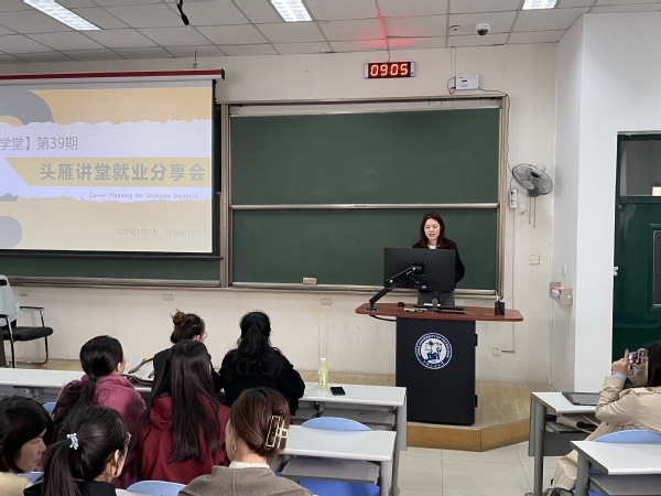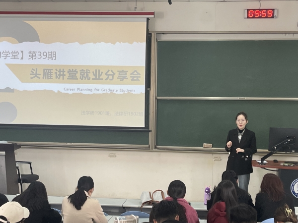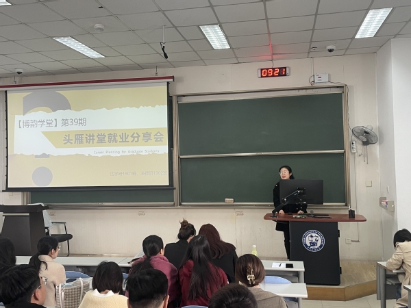 4月17日上午,600全讯白菜官方网站在东环202教室开展了博韵学堂第39期头雁讲堂就业分享会。本次座谈会由2018级法学研究生代表唐洁、焦萍、荀雅童分享,2019级法学研1901班班长王彩凤主持,600全讯白菜官方网站法学研1901班及法律研1902班的全体同学与会。