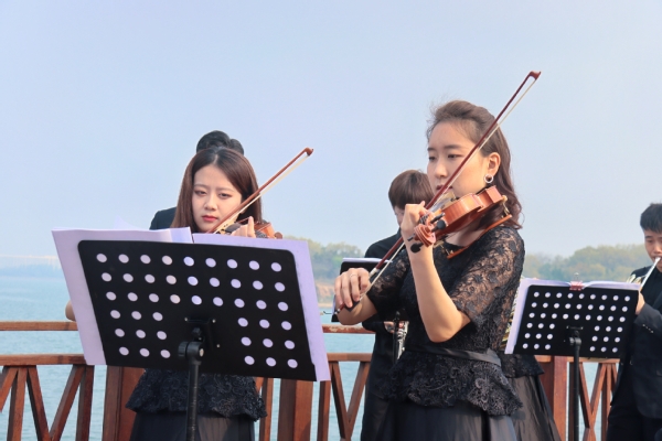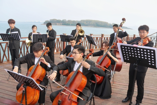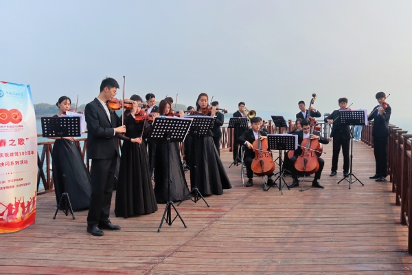 值此建党100周年之际,4月25日,中国石油大学(华东)600全讯白菜官方网站于唐岛湾河畔开展了以“青春之歌”为主题的红色快闪系列活动之《红旗颂》《保卫黄河》管弦乐队合奏,吸引百余名市民驻足观赏。