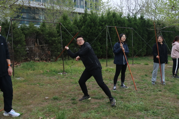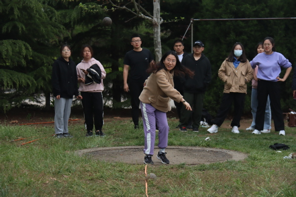 田队项目由投掷铁饼、标枪和铅球构成,学生教练提前准备器材,从基本的动作教起,如何用正确的部位发力,如何蹬腿助力,告诉运动员投掷的一些基本技巧。汉语1901班曲厚超在第一次训练中表现突出,投掷标枪的距离远超其他运动选手。在完成自己的项目训练之余,他也会向团队中的其他成员传授经验,共同进步。