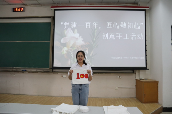 活动项目主要分为衍纸制作和绘制主题帆布包两类,同学们利用衍纸材料、帆布包、绘画涂料等基本素材,以庆祝建党一百周年为创作主题,运用卷、捏、拼等方法组合手工纸艺,依照构图、起型、着色等步骤绘制创意图案。法学研2001班的张子乐在分享自己的创作灵感时说:“因为今年是中国共产党成立一百周年,所以我选择数字100作为本次绘画的基本元素。然后在数字之内以党徽和国旗作为绘画的主要元素,与数字100生动地结合起来。本幅绘画寓意着我们伟大的中国共产党历经百年风雨,更加辉煌灿烂!”
