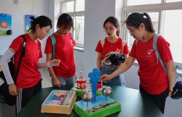 实践队员浏览村庄学生的作业 安滢霖摄