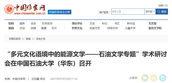 7月14日,由中国石油大学(华东)600全讯白菜官方网站主办、《中国石油大学学报(社会科学版)》编辑部协办的“多元文化语境中的能源文学——石油文学专题”学术研讨会在中国石油大学(华东)召开。来自塔吉克斯坦、黑龙江、江苏、河北、山东等国家与地区的作家、学者40余人出席了会议。会议结束后,中国作家网、《中国社会科学报》、中国社会科学网、新华网、山东省作家网、《青岛早报》、《青岛晚报》、观海新闻网、《中国石油大学报》、中国石油大学网等著名媒体、网站发表或转载了有关文章,肯定了此次会议的成果。