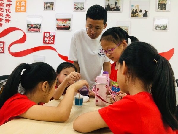 实践队采取“调研+助学”的实践模式,走进公益课堂。实践队队员于天一、 刘永豪、 袁子凝 、陈长青分别开展了不同课程教学。其中由袁子凝开展的天然酸碱指示剂的实验课给学生留下了深刻印象。首先,由你说我猜的小游戏热场,瞬间拉近了老师与学生之间的距离。课程之初,孩子们便表现出了极大的兴趣,对实验的开展表现出了强烈的期盼。课程中所需实验材料包含紫甘蓝、 脉动、 小苏打 、柠檬、 雪碧、 食盐等安全无污染物质。这些实验材料简单易得,在家中就可以完成制备,有利于启发青少年在日常生活中的科学思维,锻炼青少年在日常生活中的动手能力。实验期间学生分组进行对照实验,学生们小心搅拌,专注配制,伴随着紫、蓝、粉这几种颜色变幻的是他们的阵阵惊呼。“我!我!我会!”队员袁子凝在课程最后设置了问答环节,话音未落,小孩子们纷纷举高手臂,后排的甚至从座位上站起来,身体努力地向前倾。这使得他们在有趣的实验中不仅得到了娱乐还学习到了丰富的知识。这堂生动有趣的化学实验课不仅教授课外拓展知识,更激发了探索求知的科学精神和动手能力。“你们明天还来吗?”“下次我们上什么课啊?”“我喜欢你们来!”稚嫩的声音充盈了整个教室,小小的手臂环抱住老师,仰起脸庞,眼神中充满期待。其他队员的课程内容也相继让孩子们在轻松愉快的氛围里得到了许多收获,让他们在兴趣培养、素质提升,能力提高等方面都有了重要突破。