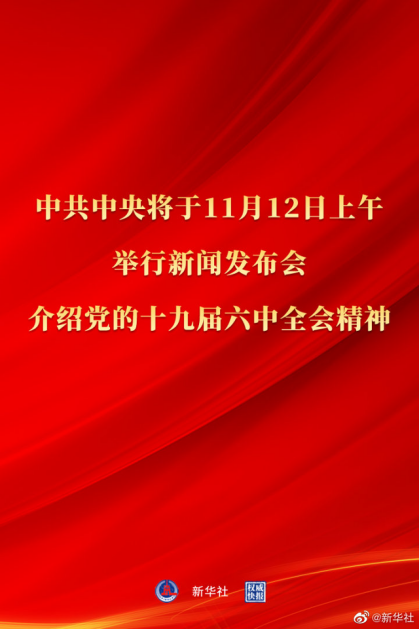 中共中央将于11月12日上午10时举行新闻发布会,介绍党的十九届六中全会精神。中央广播电视总台及人民网、新华网、中国网等将对新闻发布会进行直播。