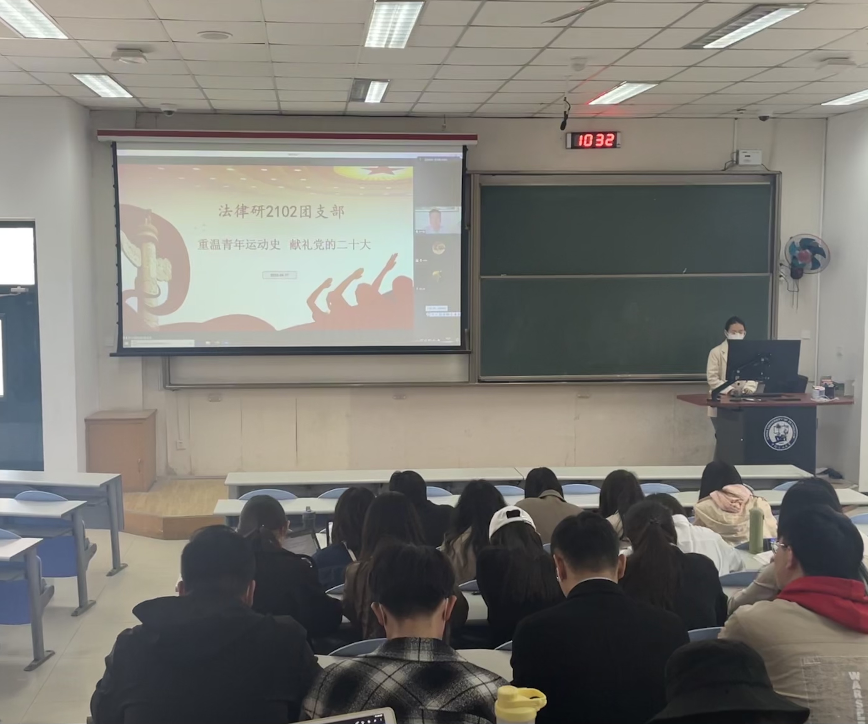 此外,研究生各团支部也积极响应学院号召,运用多种形式开展庆祝建团100周年活动。法学研2101团支部通过观看微电影、分享观看心得与合唱共青团歌的形式开展了“致敬先烈 吾辈自强”主题团日活动。法律研2102团支部以“世界读书日”为契机开展了以支部成员书籍互荐和共读红色经典书籍为主要形式的“团支部读书月”活动,在前期阅读环节完成后,又举办了“诵读红色经典,致敬光辉百年”读书分享会。活动结束后,“既读书,便要为中华之崛起而读书”的誓言熔铸为支部内每一位团员青年心中的使命与担当。汉硕2101团支部举行了“观看红色电影,致敬光辉百年”的活动,组织支部成员集体观看了电影《长津湖》。