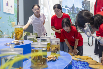 讲解员为实践队员介绍大闸蟹标本 罗凌云 摄